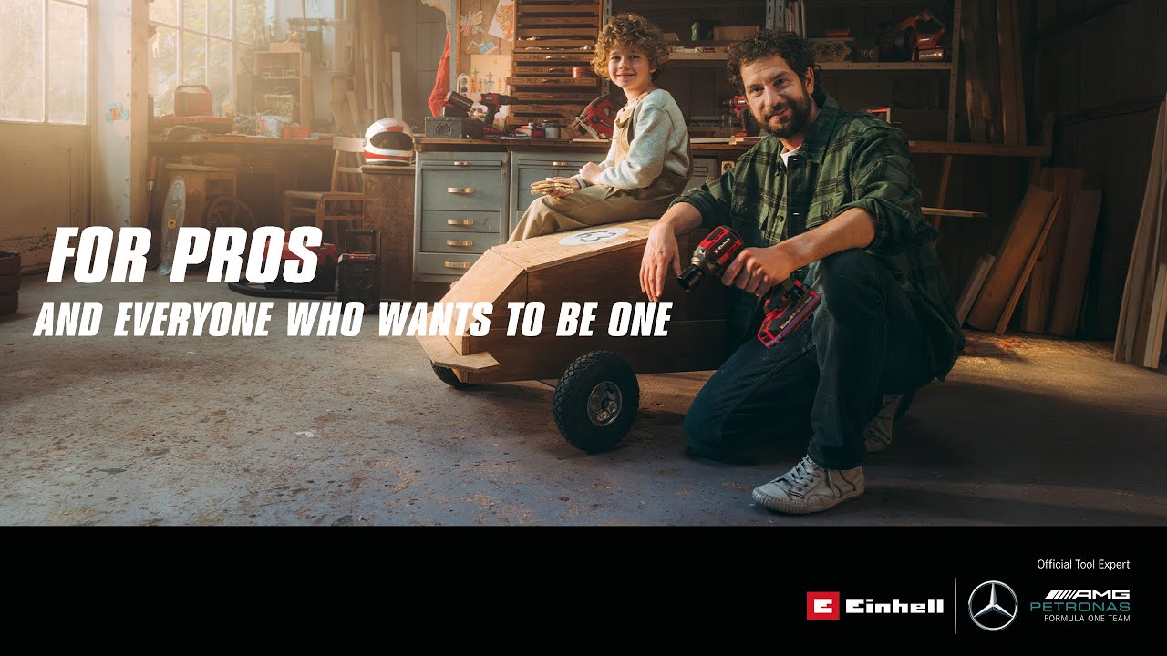 Нашият рекламен клип показва връзката между два свята, които ние в Einhell създаваме по нов начин всеки ден: светът на професионалистите, ориентиран към високи постижения, в гаража на отбора Mercedes-AMG PETRONAS Formula 1 Team, и творческият свят на „Направи си сам“, където баща и син изведнъж се превръщат в професионални автомобилни механици.